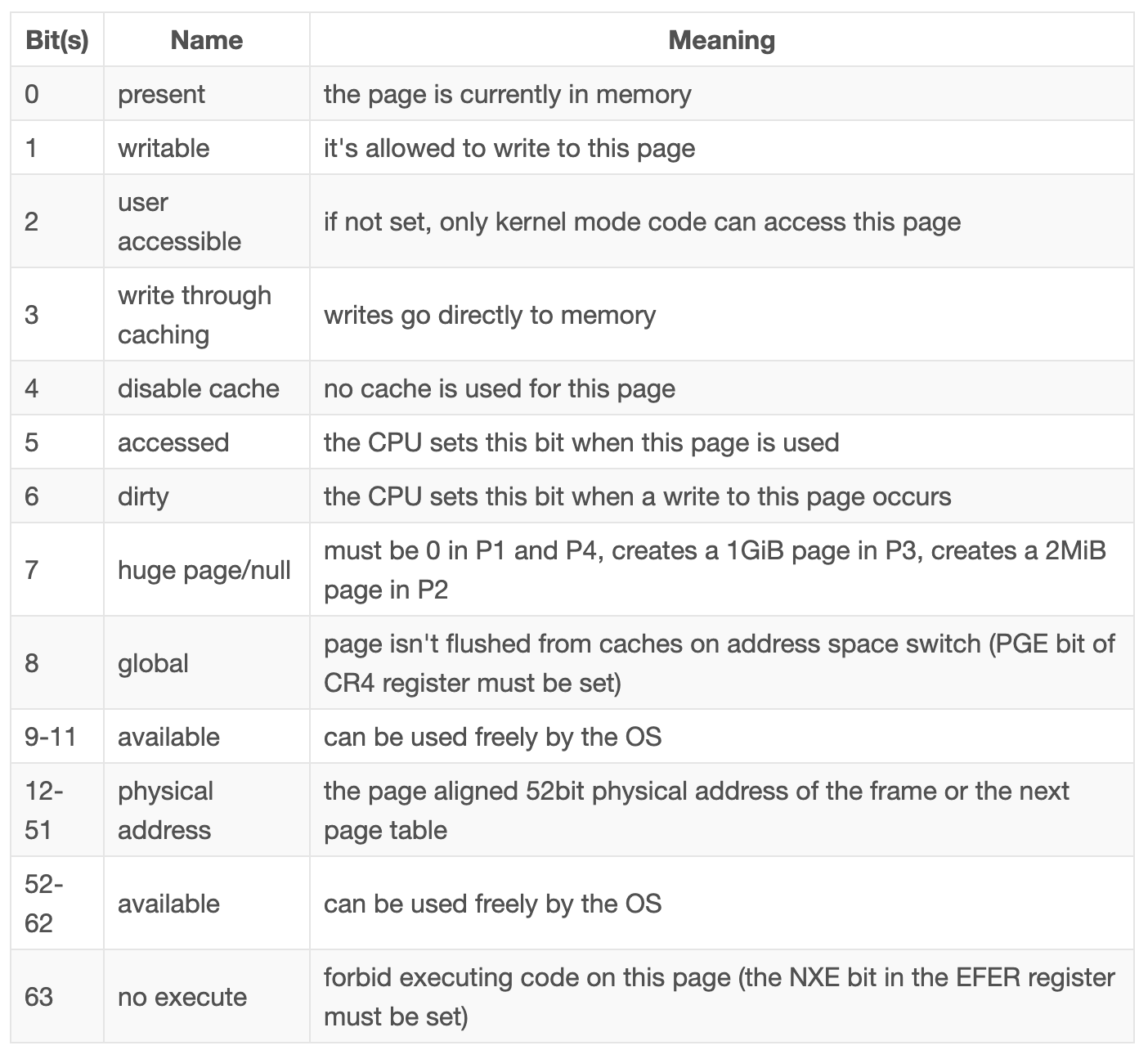 x86_64体系结构使用4级页表,页大小为4KiB。每个页表独立于级别,有512个固定大小的条目。每个条目的大小为8字节,因此每个表的大小为512*8B=4KiB,因此正好适合一个页面。