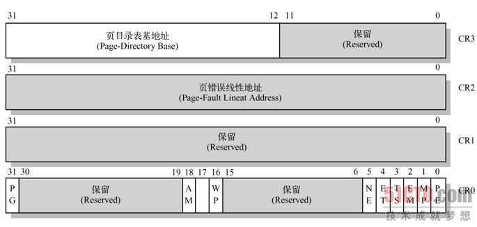 控制寄存器(CR0~CR3)用于控制和确定处理器的操作模式以及当前执行任务的特性。CR0中含有控制处理器操作模式和状态的系统控制标志;CR1保留不用;CR2含有导致页错误的线性地址;CR3中含有页目录表物理内存基地址,因此该寄存器也被称为页目录基地址寄存器PDBR(Page-Directory Base address Register)。