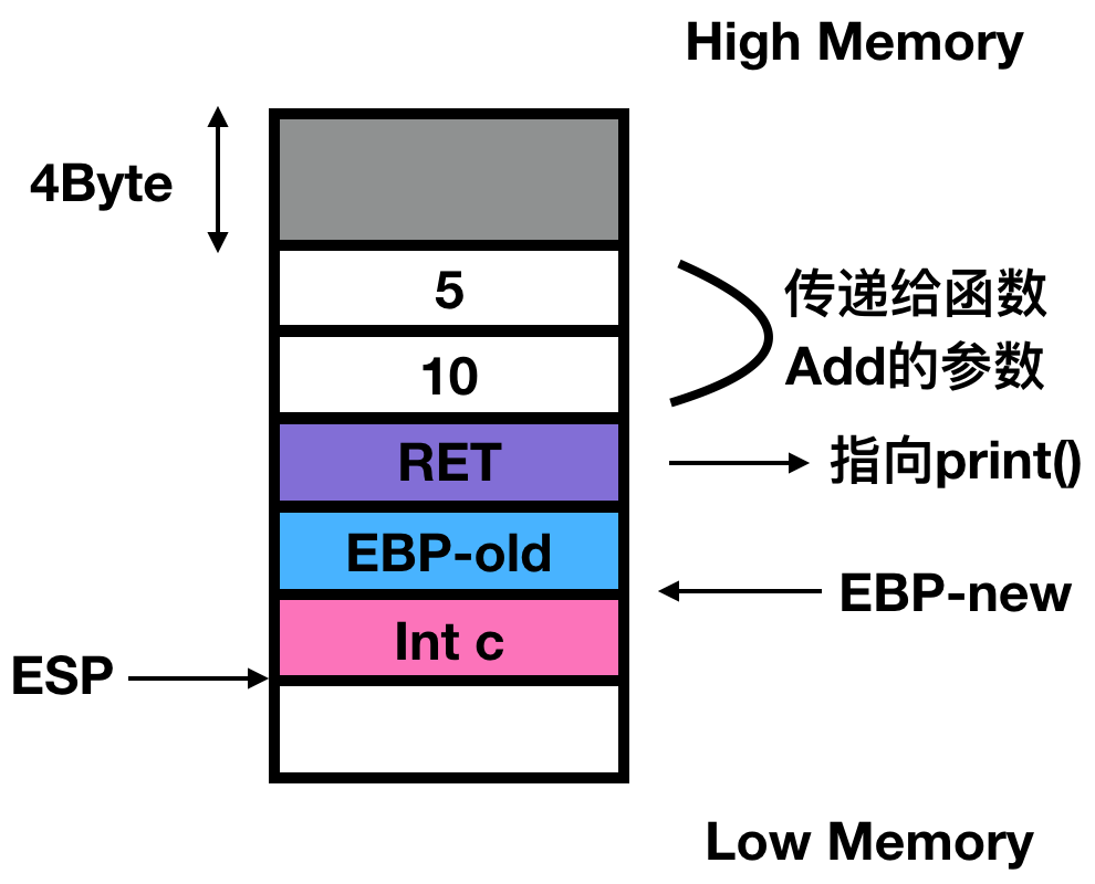 当Add函数调用执行完毕之后,我们需通过某种方式返回到main函数中继续执行下面的指令,在本例中也就是执行print函数。解决这个问题的方式就是将下一条指令的地址压入栈中: