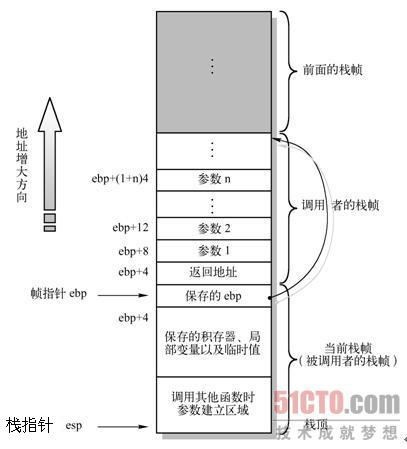 大多数CPU上的程序实现使用栈来支持函数调用操作。栈被用来传递函数参数、存储返回信息、临时保存寄存器原有值以备恢复以及用来存储局部数据。单个函数调用操作所使用的栈部分被称为栈帧(stack frame)结构,其一般结构如下图所示。栈帧结构的两端由两个指针来指定。寄存器%ebp通常用做帧指针(frame pointer),而esp则用作栈指针(stack pointer)。在函数执行过程中,栈指针esp会随着数据的入栈和出栈而移动,因此函数中对大部分数据的访问都基于帧指针%ebp进行。(通过对ebp的加减运算来指定在某个数据的地址)