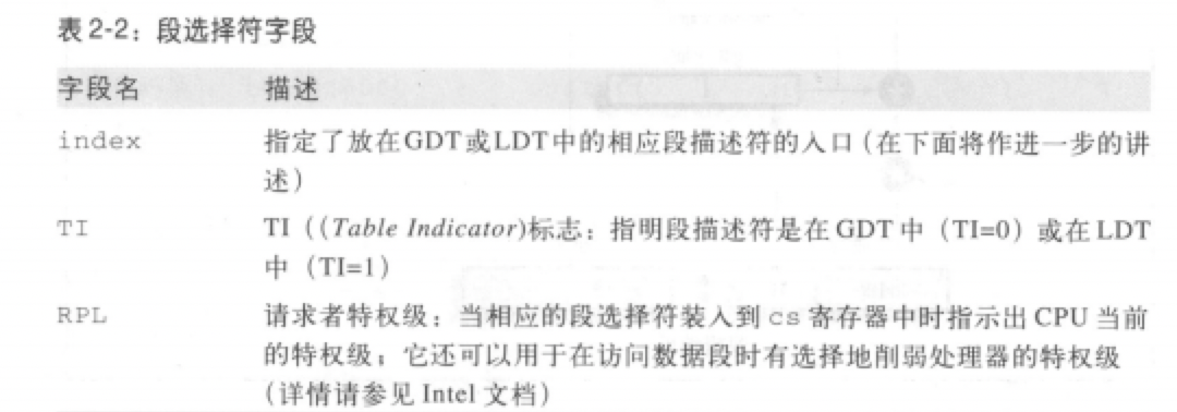 实模式下的段寄存器(如cs,ss等)在保护模式下叫段选择子(Selector),用来存放段选择符
