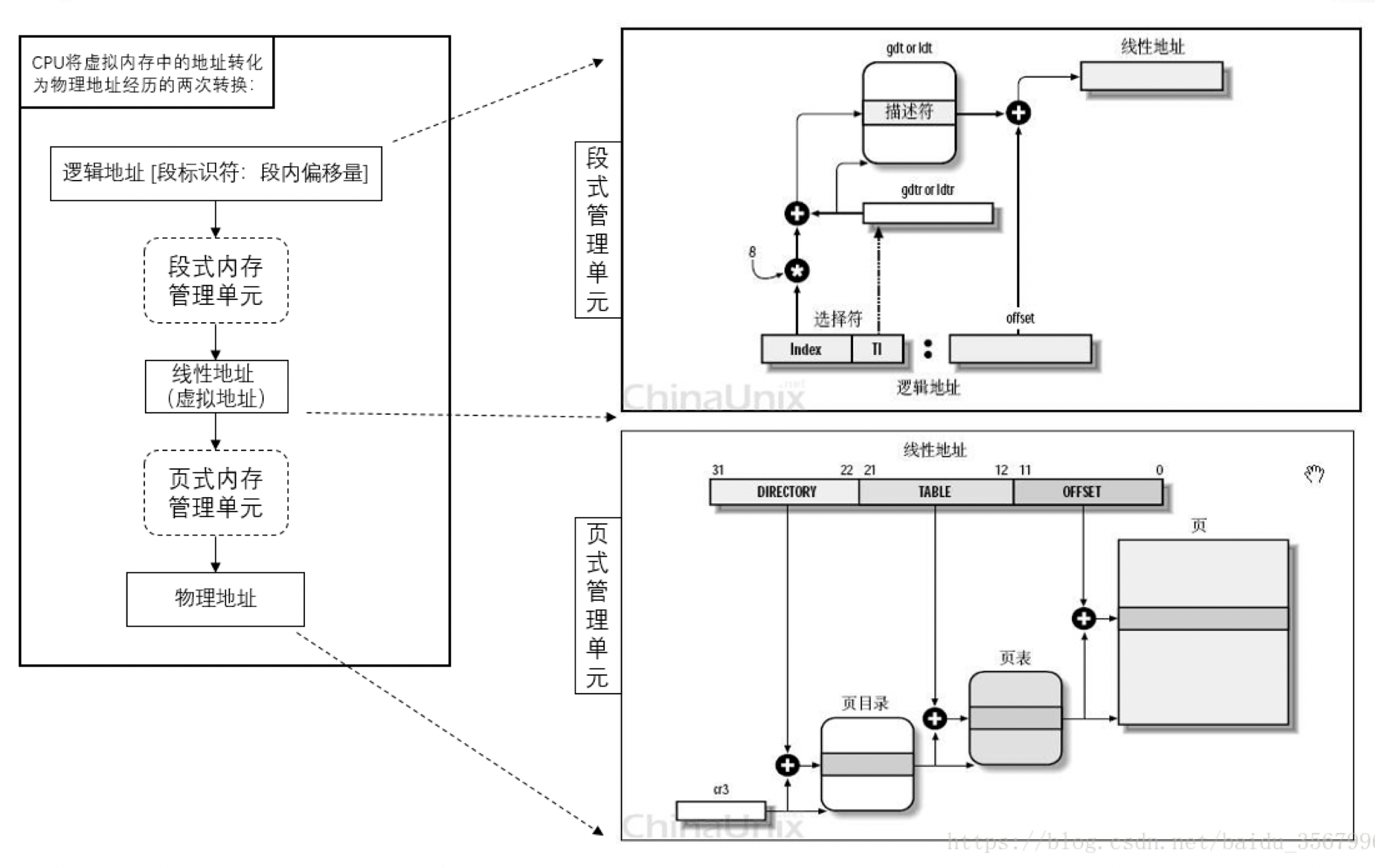 程序过来一个逻辑地址,使用其段标识符(也即段选择符)的Index字段去索引段描述符表,若TI=0,索引全局段描述符表,TI=1,索引局部段描述符表,表的地址在相应的寄存器中。通过Index字段和段描述符表的位置能找到某项具体的段描述符。将段描述符中的base字段和逻辑地址中的offset字段合并即得到了线性地址。
